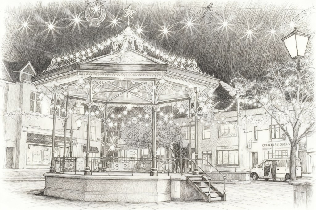 She slipped her arm through mine and together we walked, away from the bandstand as the last few notes of Silent Night brought to an end the evening’s musical extravaganza that was now being watched by a crowd of four pensioners, three dogs and two bearded drunks who stood deep in grizzled conversation.